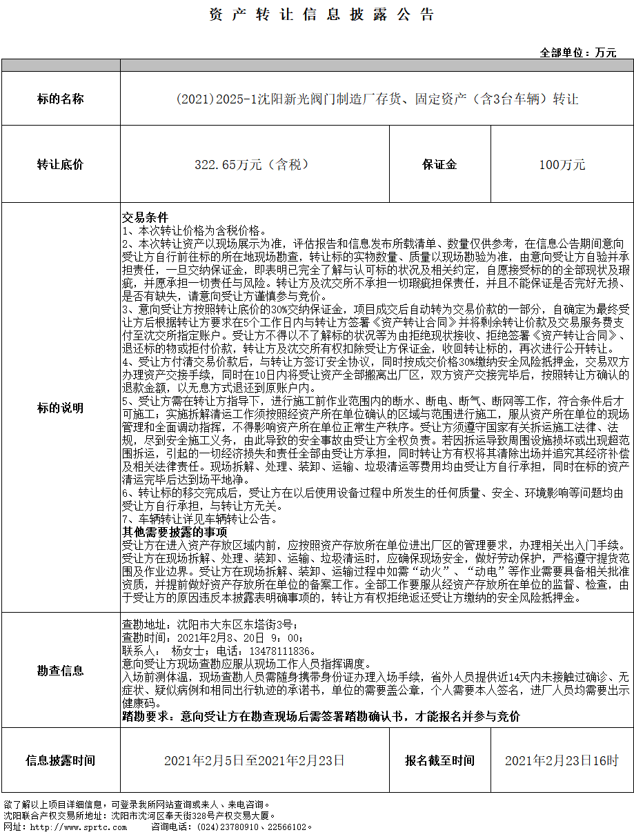 沈陽新光閥門制造廠存貨、固定資產(chǎn)(含3臺車輛)轉(zhuǎn)讓
