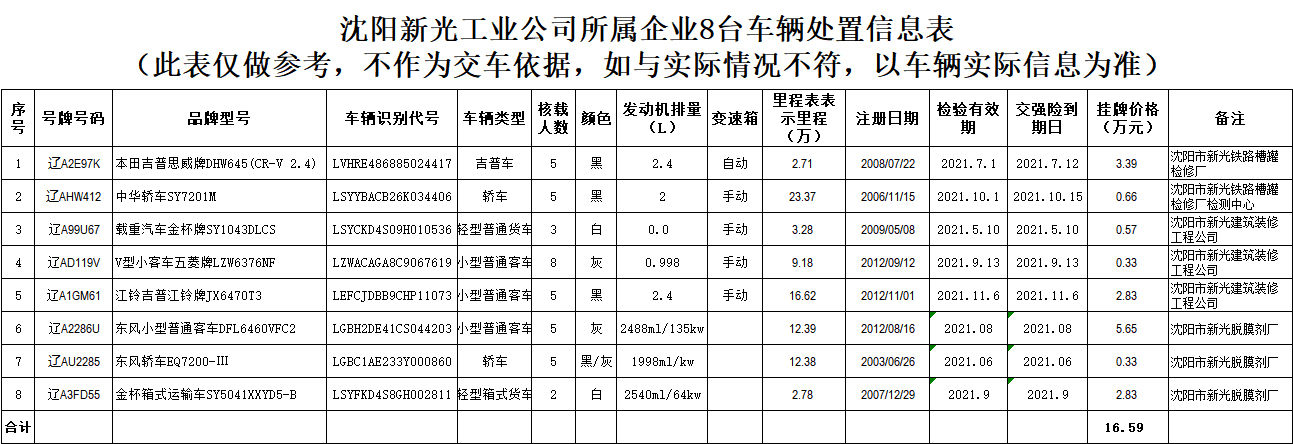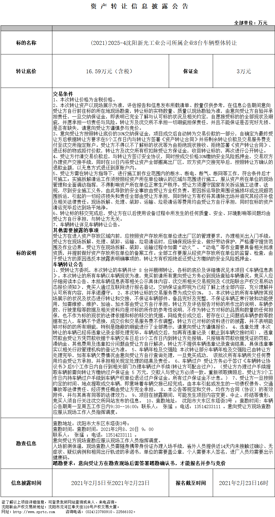 沈陽(yáng)新光工業(yè)公司所屬企業(yè)8臺(tái)車輛整體轉(zhuǎn)讓