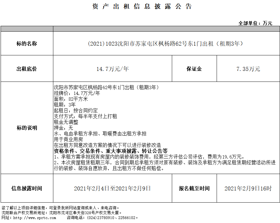 沈陽市蘇家屯區(qū)楓楊路62號東1門出租(租期3年)