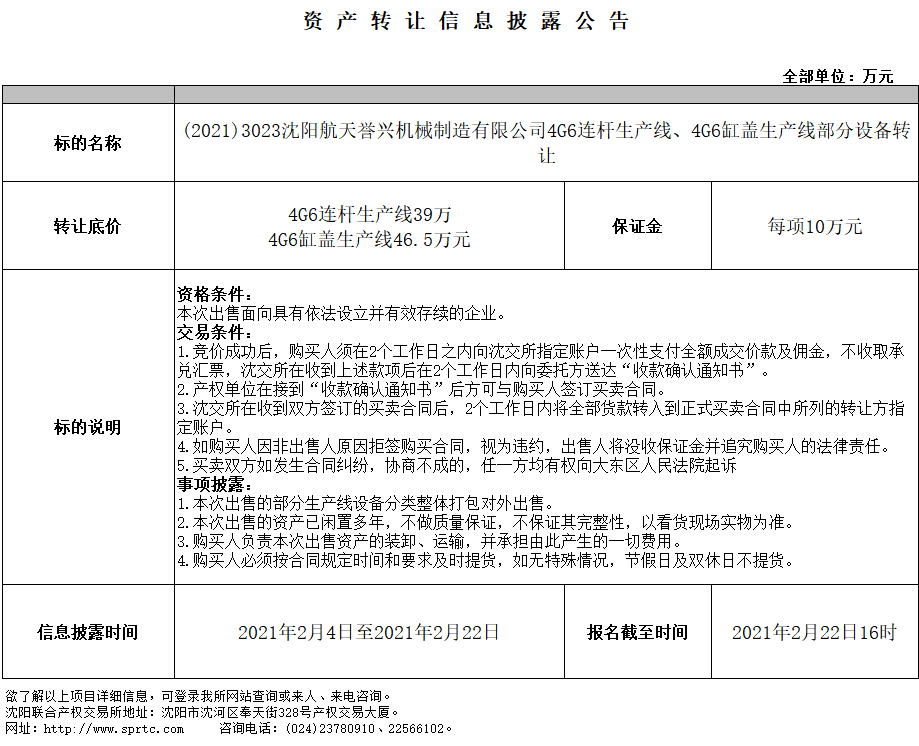沈陽航天譽(yù)興機(jī)械制造有限公司4G6連桿生產(chǎn)線部分設(shè)備轉(zhuǎn)讓