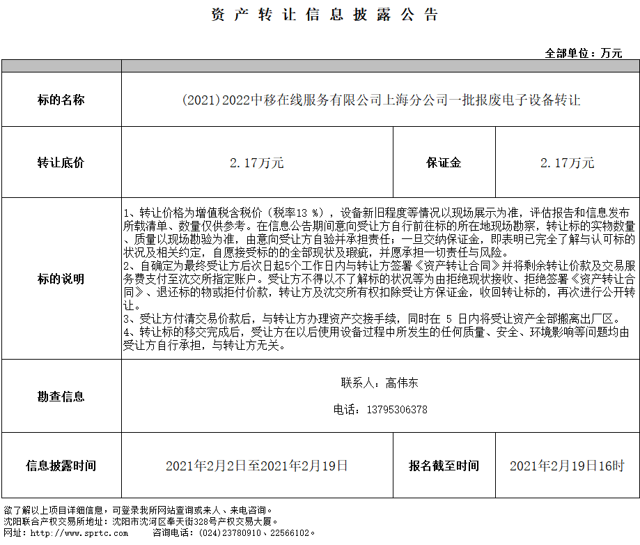 中移在線服務(wù)有限公司上海分公司一批報(bào)廢電子設(shè)備轉(zhuǎn)讓