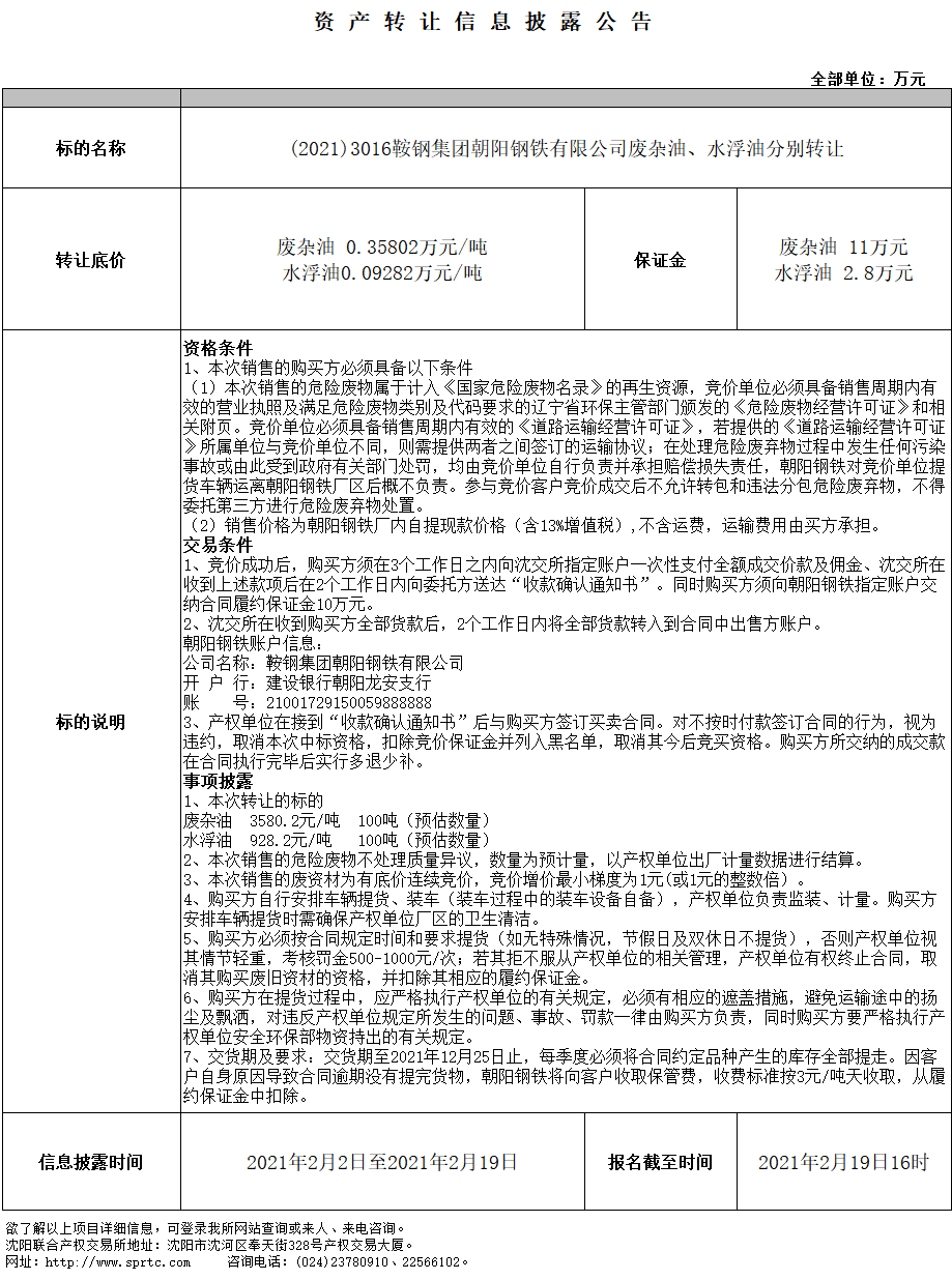 鞍鋼集團(tuán)朝陽(yáng)鋼鐵有限公司廢雜油轉(zhuǎn)讓