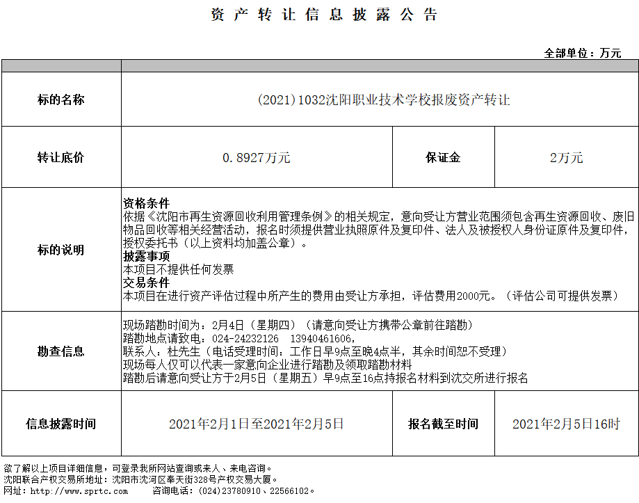 (2021)1032沈陽職業(yè)技術學校報廢資產轉讓
