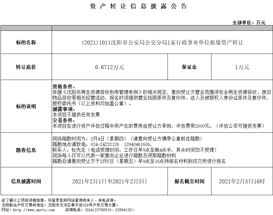 沈陽市公安局公交分局1家行政事業(yè)單位報廢資產(chǎn)轉讓