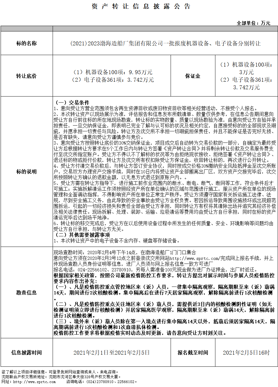 渤海造船廠集團有限公司一批報廢電子設備轉讓