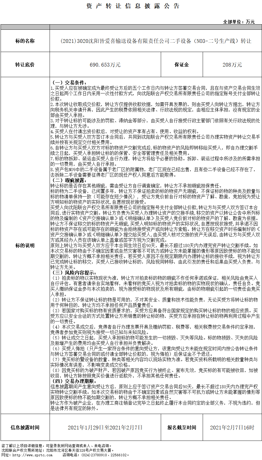 沈陽皆愛喜輸送設(shè)備有限責(zé)任公司二手設(shè)備轉(zhuǎn)讓(NO3二號生產(chǎn)線第五次)