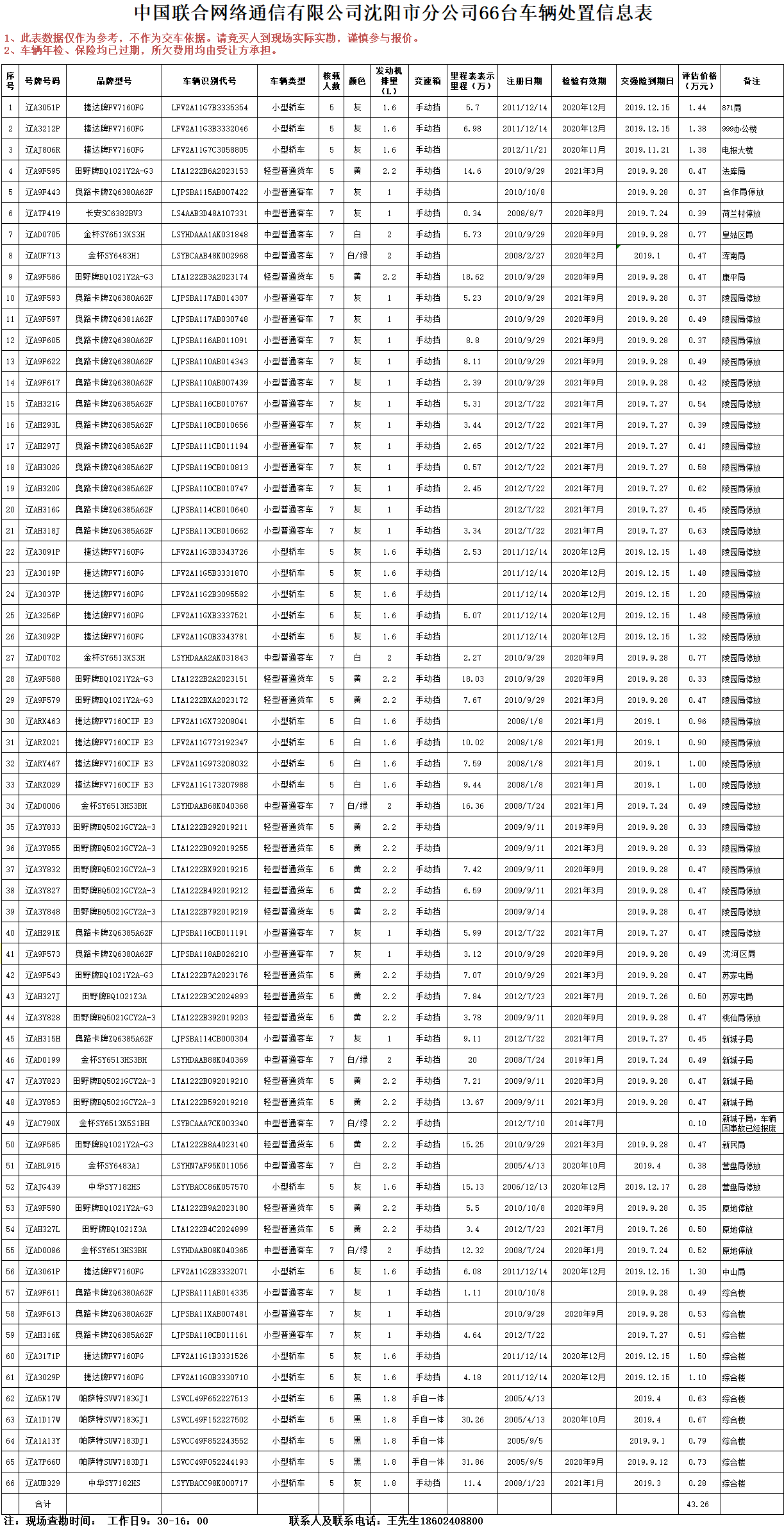中國(guó)聯(lián)合網(wǎng)絡(luò)通信有限公司沈陽(yáng)市分公司66臺(tái)車輛整體轉(zhuǎn)讓