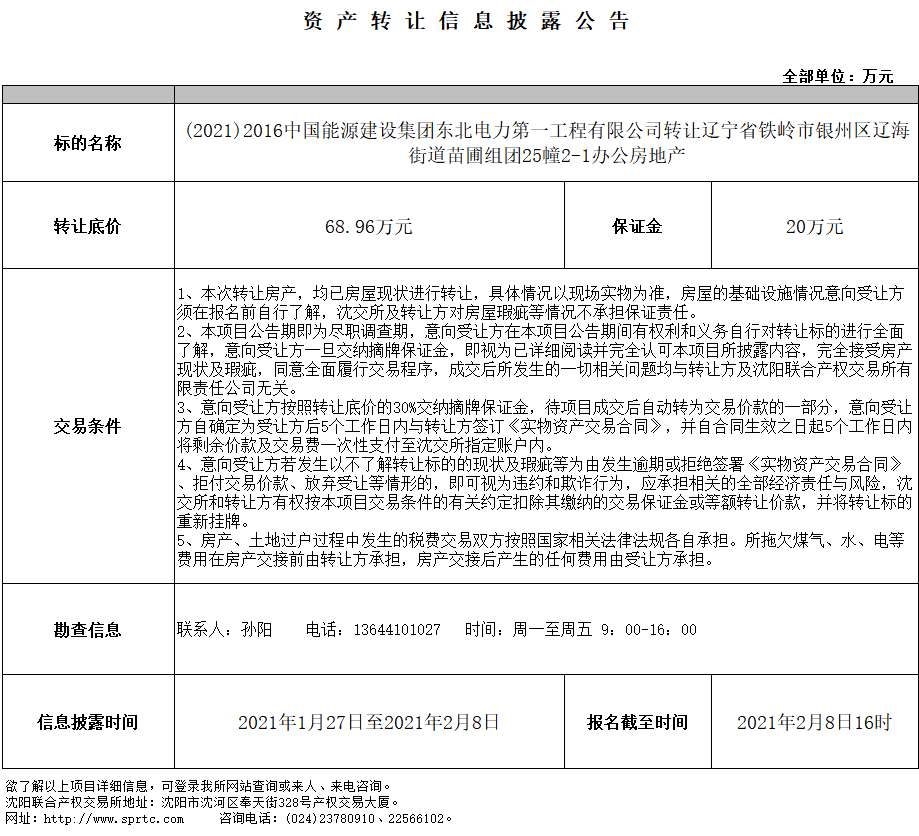 中國能源建設集團東北電力第一工程有限公司轉(zhuǎn)讓遼寧省鐵嶺市銀州區(qū)遼海街道苗圃組團25幢2-1辦公房地產(chǎn)