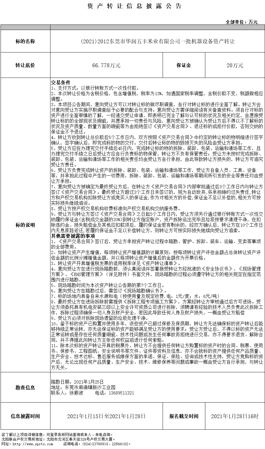 東莞市華潤(rùn)五豐米業(yè)有限公司一批機(jī)器設(shè)備 資產(chǎn)轉(zhuǎn)讓
