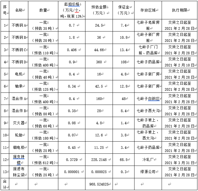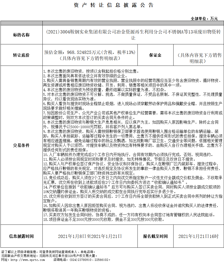 (2021)3004鞍鋼實(shí)業(yè)集團(tuán)有限公司冶金資源再生利用分公司不銹鋼A等13項(xiàng)廢舊物資轉(zhuǎn)讓
