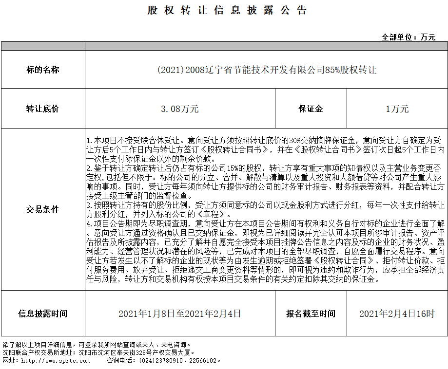 遼寧省節(jié)能技術(shù)開(kāi)發(fā)有限公司85%股權(quán)轉(zhuǎn)讓