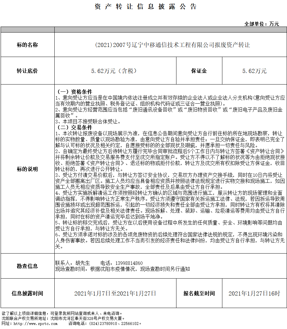 遼寧中移通信技術(shù)工程有限公司報(bào)廢資產(chǎn)轉(zhuǎn)讓