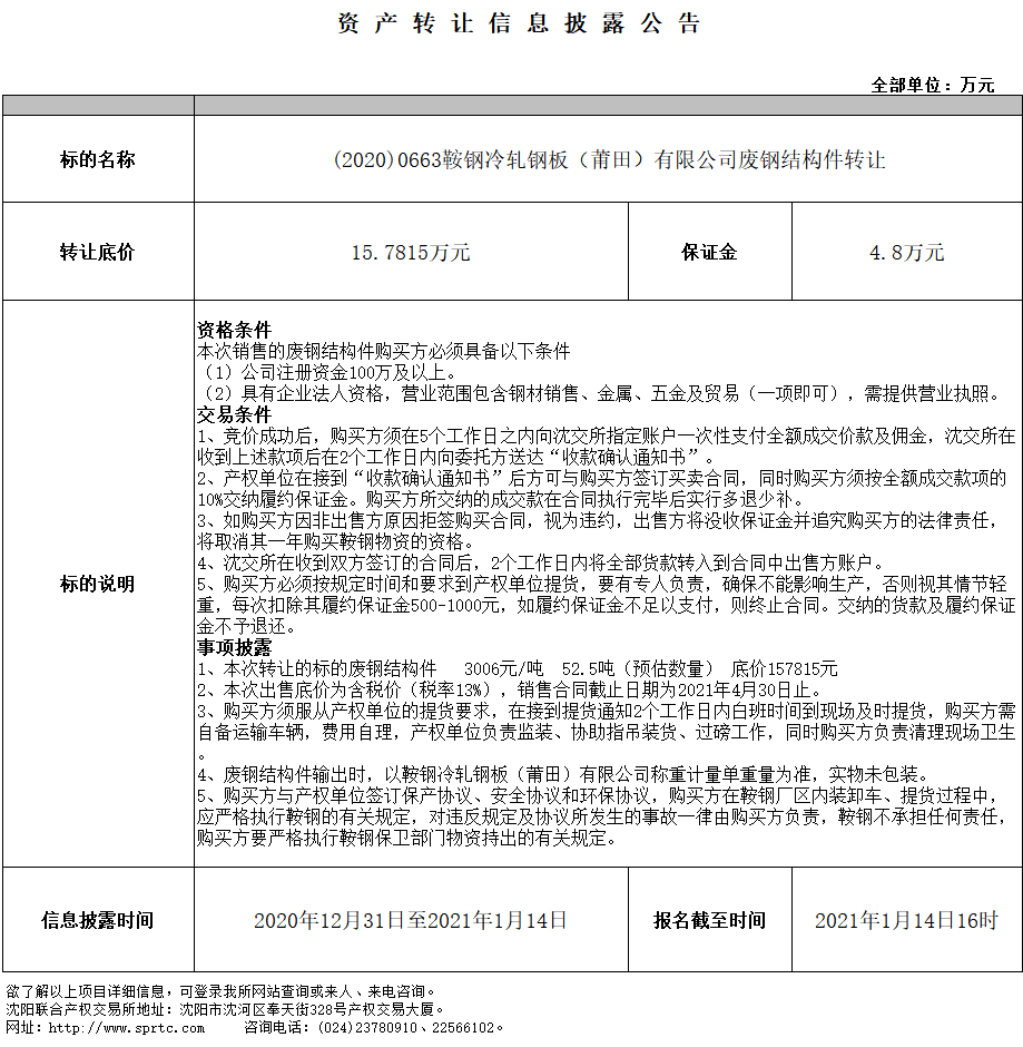 鞍鋼冷軋鋼板(莆田)有限公司廢鋼結(jié)構(gòu)件轉(zhuǎn)讓