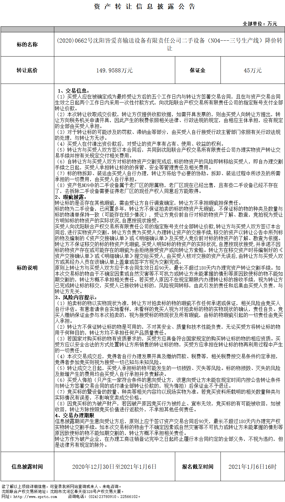 沈陽皆愛喜輸送設備有限責任公司二手設備轉讓(NO4生產線)