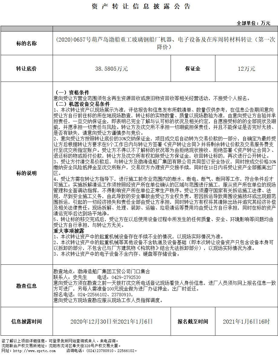 葫蘆島渤船重工玻璃鋼船廠機器、電子設備及在庫周轉材料轉讓(第一次降價)資產(chǎn)轉讓