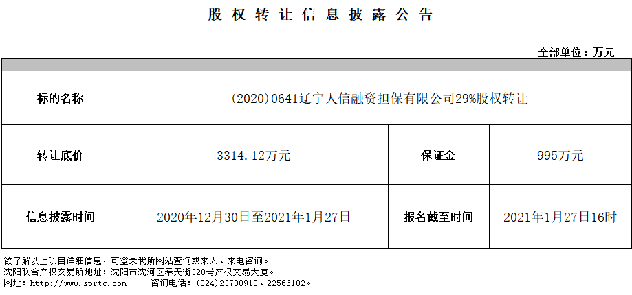 遼寧人信融資擔(dān)保有限公司29%股權(quán)轉(zhuǎn)讓