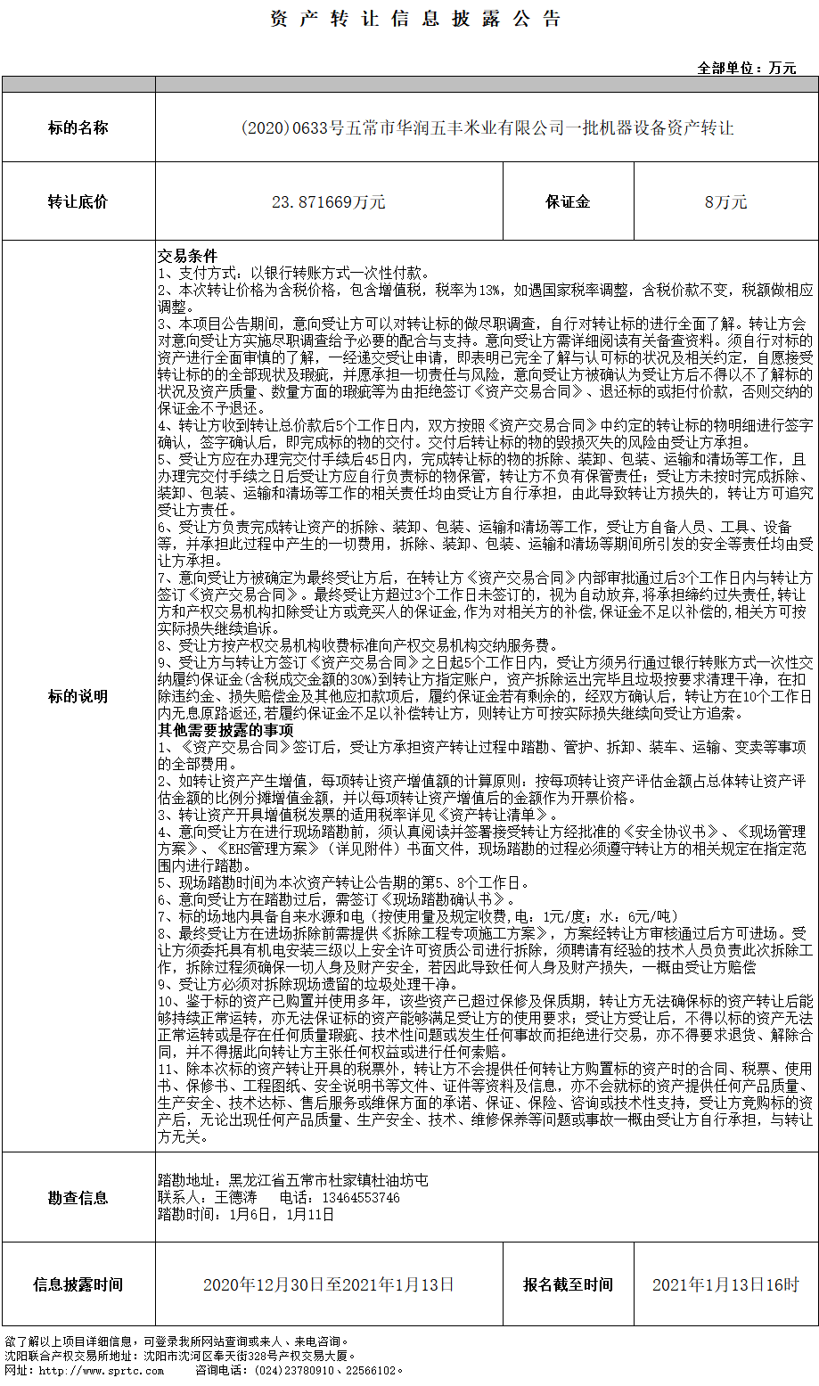 五常市華潤五豐米業(yè)有限公司一批機器設備資產轉讓
