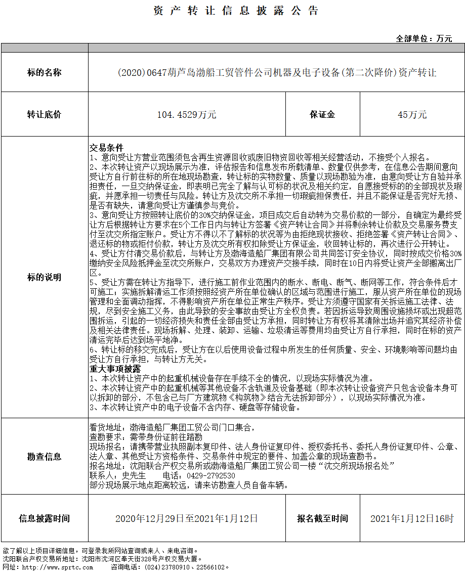 葫蘆島渤船工貿(mào)管件公司機(jī)器及電子設(shè)備(第二次降價(jià))資產(chǎn)轉(zhuǎn)讓