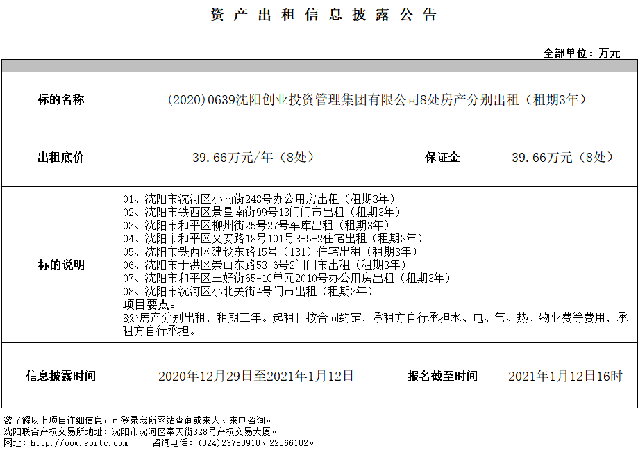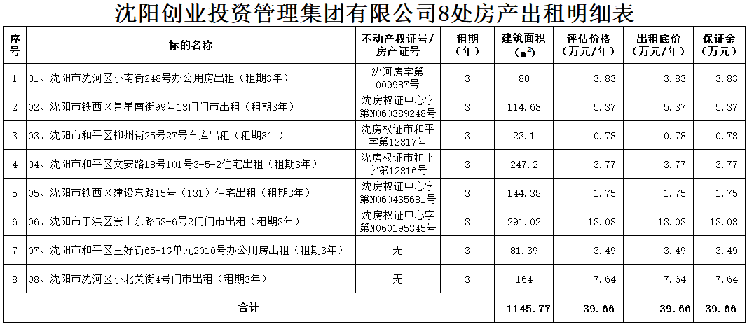 (2020)0639沈陽創(chuàng)業(yè)投資管理集團(tuán)有限公司8處房產(chǎn)分別出租(租期3年)