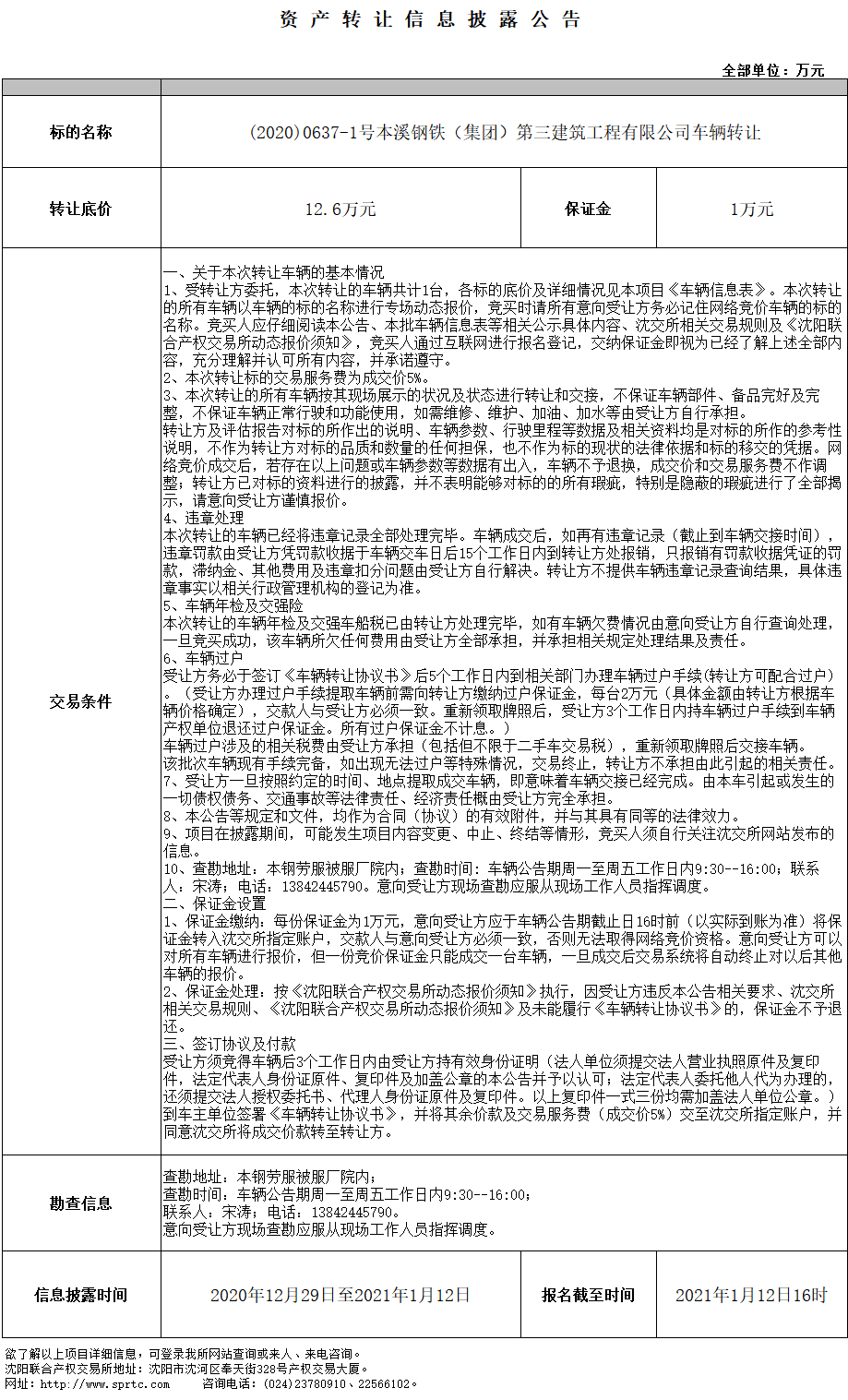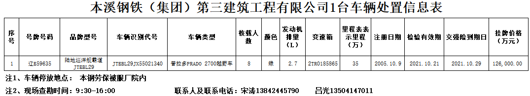 本溪鋼鐵(集團(tuán))第三建筑工程有限公司1臺車輛轉(zhuǎn)讓
