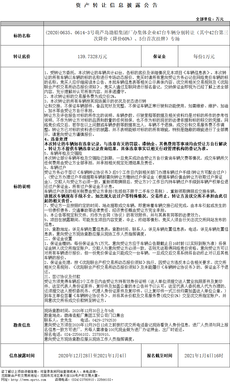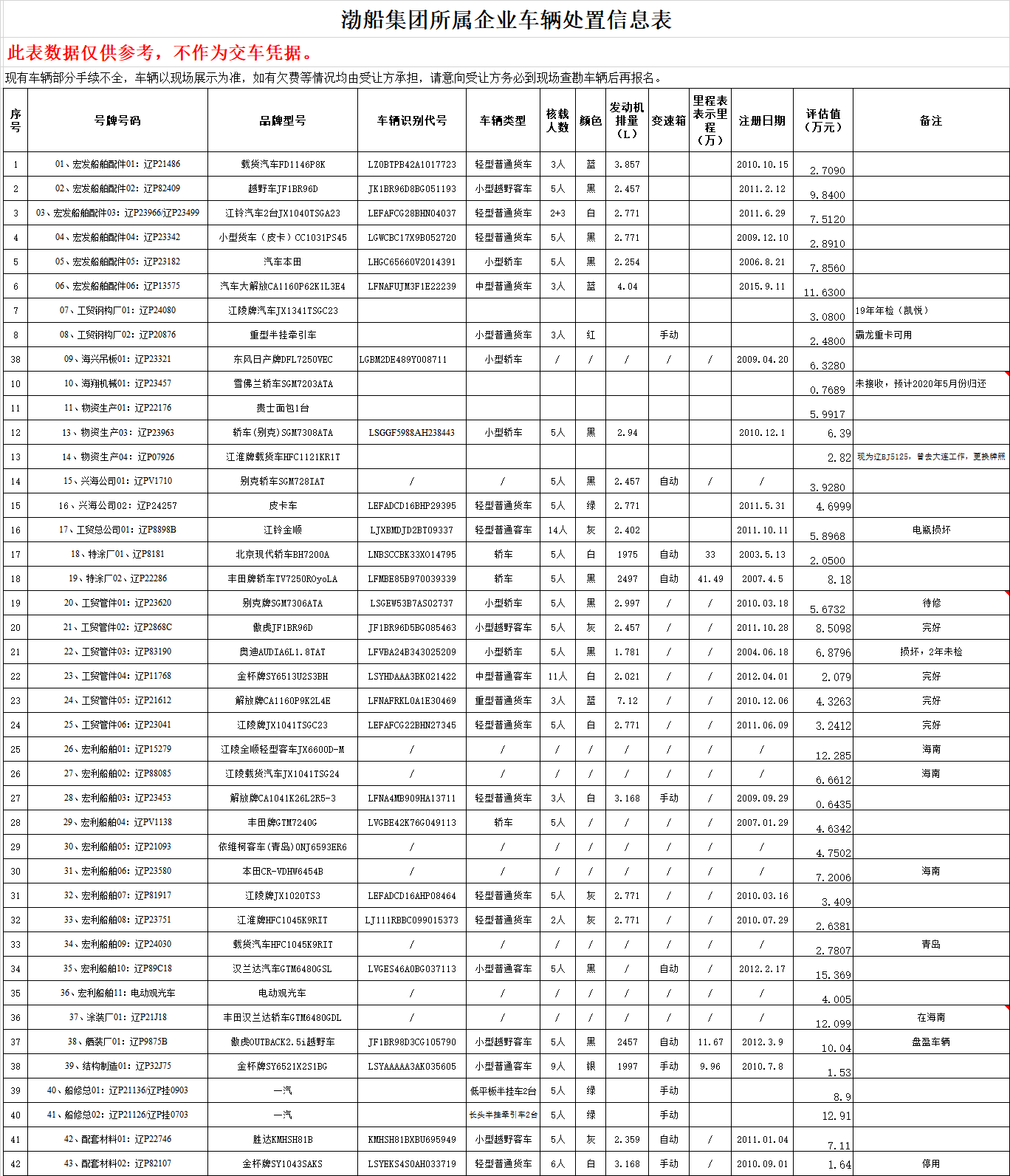 (2020)0635、0614-3號(hào)葫蘆島渤船集團(tuán)廠辦集體企業(yè)47臺(tái)車輛分別轉(zhuǎn)讓(其中42臺(tái)第三次降價(jià)(降價(jià)60%)、5臺(tái)首次掛牌)專場(chǎng)
