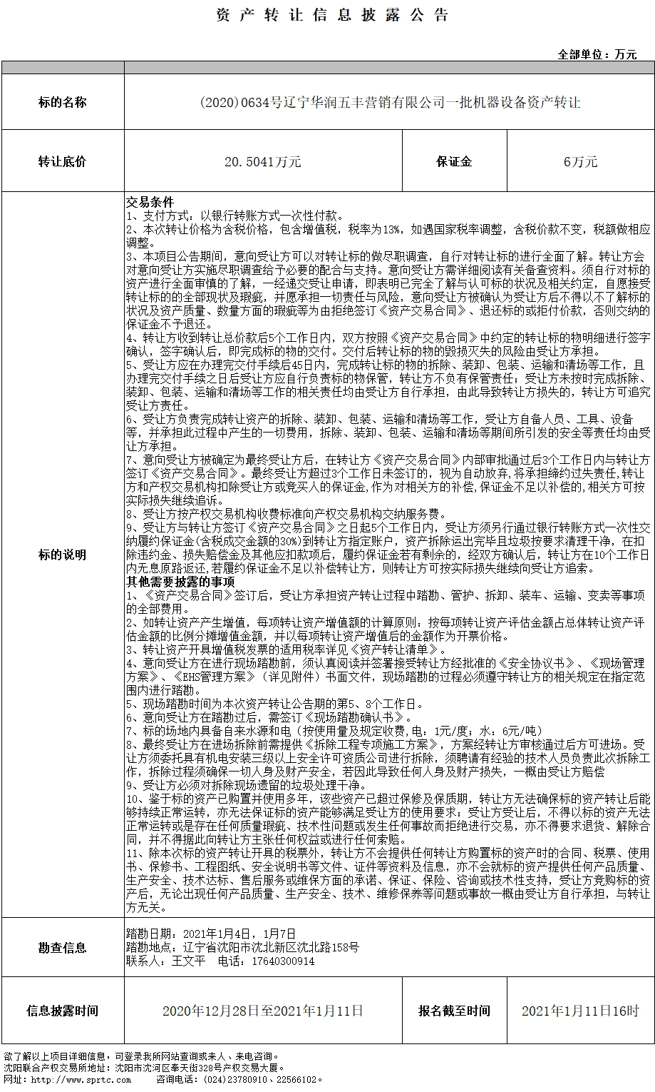 遼寧華潤五豐營銷有限公司一批機器設備資產(chǎn)轉讓