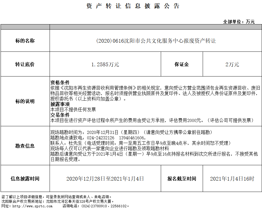 沈陽市公共文化服務中心報廢資產(chǎn)轉(zhuǎn)讓