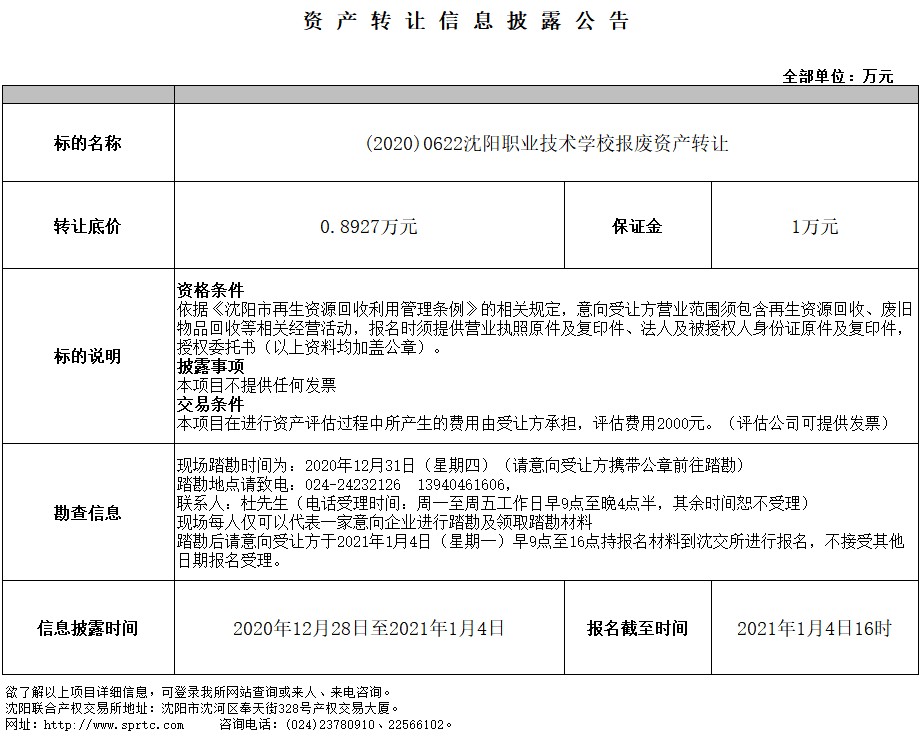 沈陽職業(yè)技術(shù)學(xué)校報廢資產(chǎn)轉(zhuǎn)讓