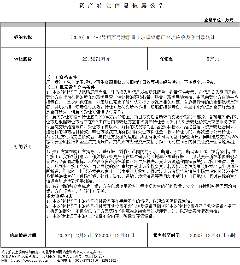 葫蘆島渤船重工玻璃鋼船廠24項應(yīng)收及預(yù)付款轉(zhuǎn)讓
