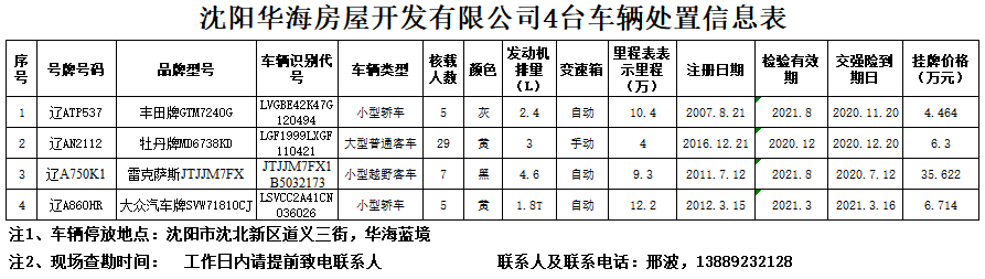 沈陽華海房屋開發(fā)有限公司 4臺車輛捆綁轉讓