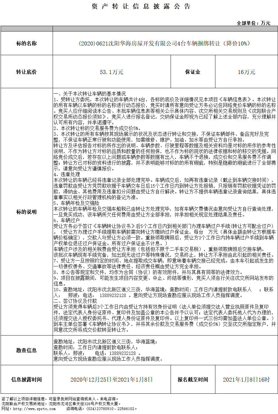 (2020)0621沈陽華海房屋開發(fā)有限公司4臺車輛捆綁轉讓(降價10%)