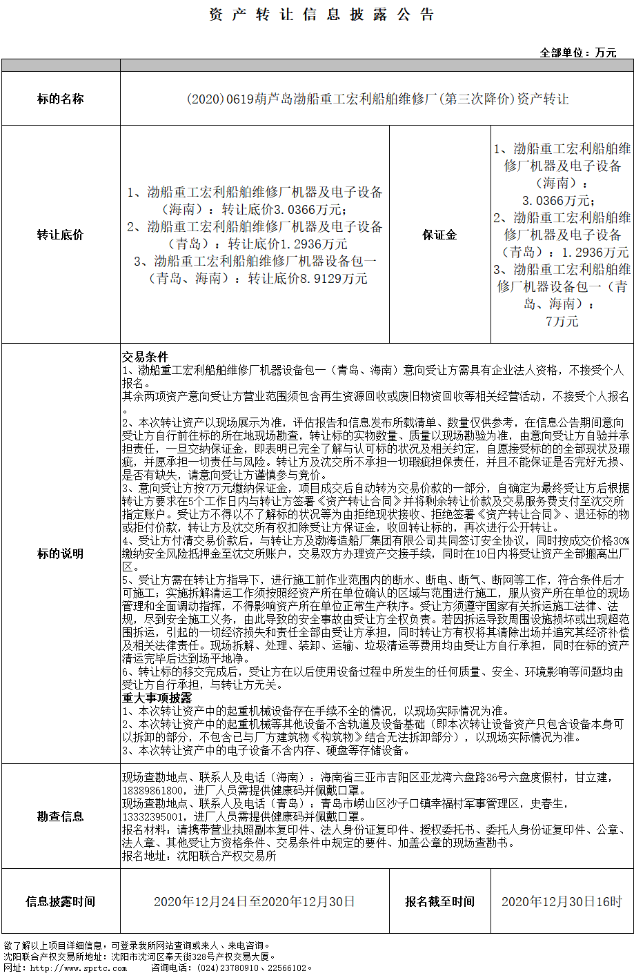 渤船重工宏利船舶維修廠機(jī)器及電子設(shè)備(第三次降價(jià))轉(zhuǎn)讓 (海南)