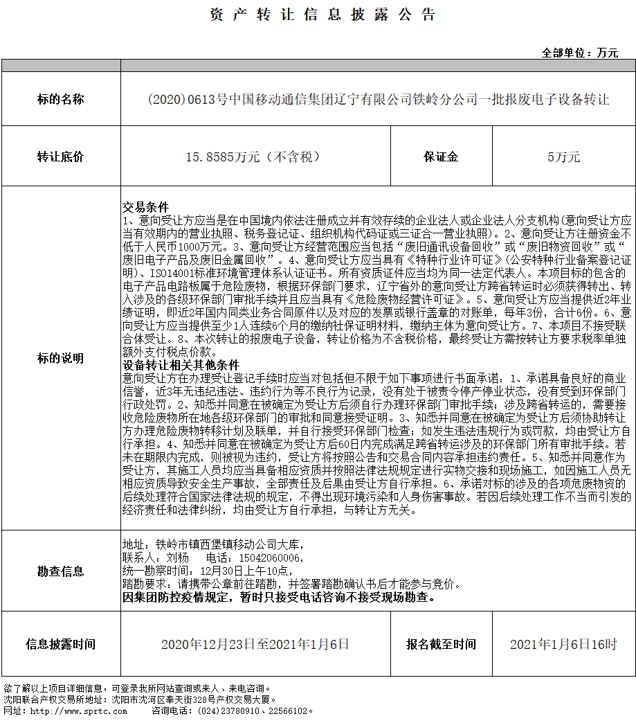 中國移動通信集團遼寧有限公司鐵嶺分公司一批報廢電子設備轉讓