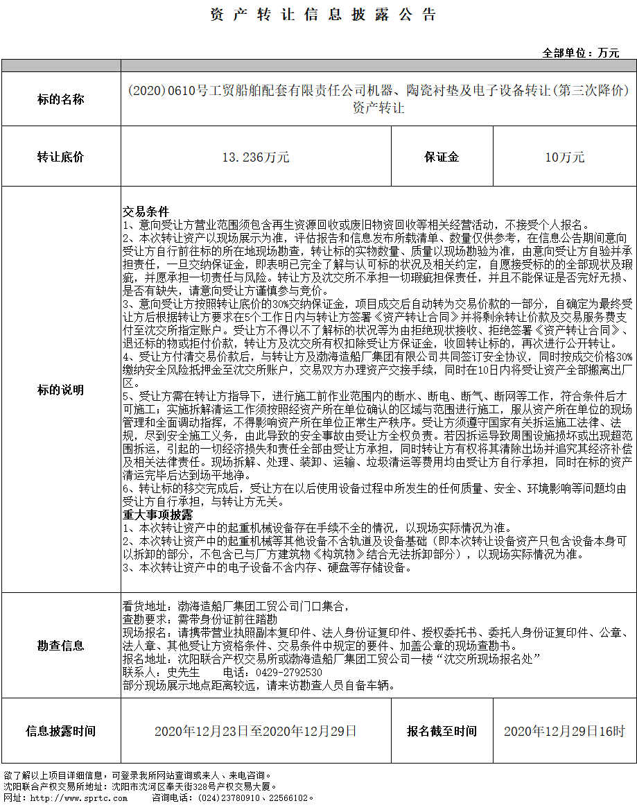 工貿(mào)船舶配套有限責(zé)任公司機(jī)器、陶瓷襯墊及電子設(shè)備轉(zhuǎn)讓(第三次降價(jià))資產(chǎn)轉(zhuǎn)讓