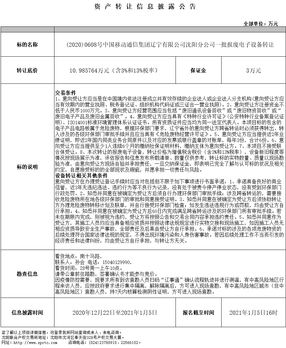 中國(guó)移動(dòng)通信集團(tuán)遼寧有限公司沈陽(yáng)分公司一批報(bào)廢電子設(shè)備 轉(zhuǎn)讓