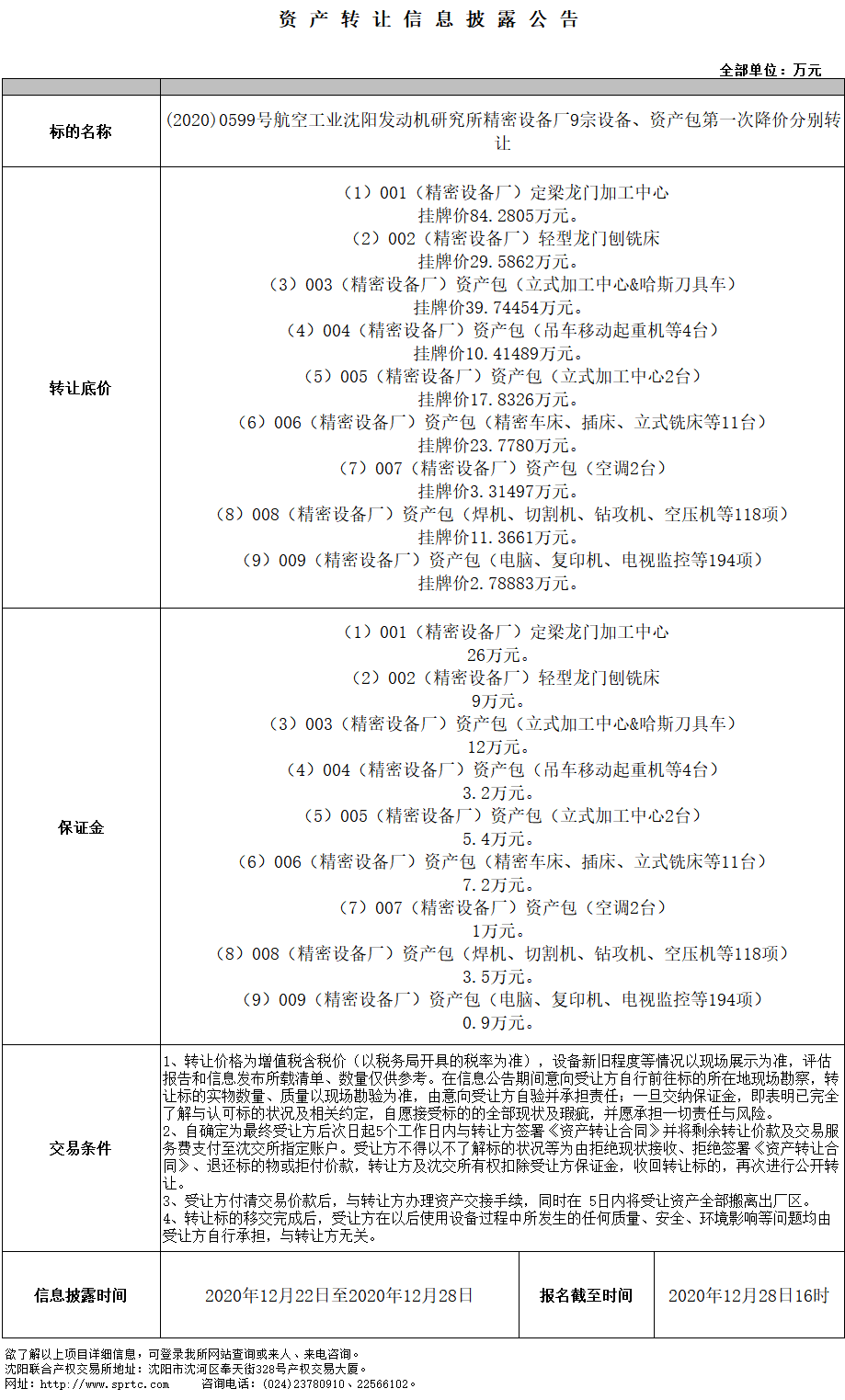 (2020)0599號(hào)航空工業(yè)沈陽(yáng)發(fā)動(dòng)機(jī)研究所精密設(shè)備廠9宗設(shè)備、資產(chǎn)包第一次降價(jià)分別轉(zhuǎn)讓