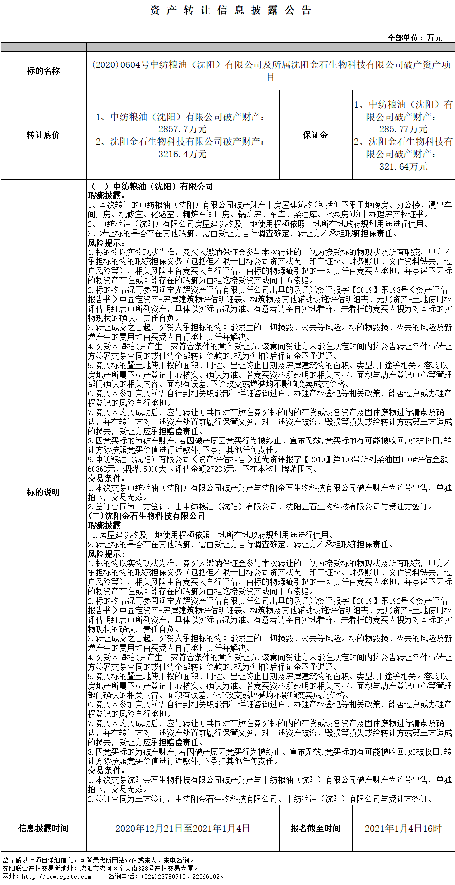 中紡糧油(沈陽)有限公司破產(chǎn)資產(chǎn)