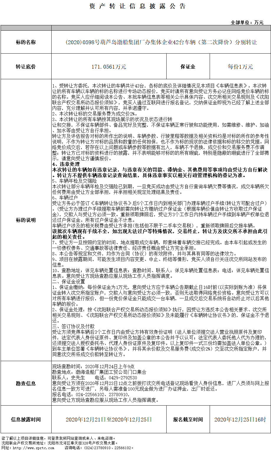 (2020)0598號葫蘆島渤船集團廠辦集體企業(yè)42臺車輛(第二次降價)分別轉(zhuǎn)讓