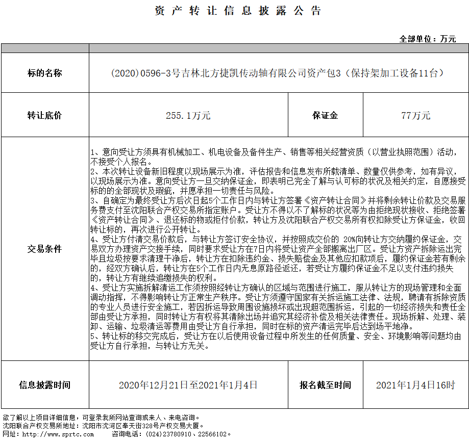 吉林北方捷凱傳動(dòng)軸有限公司資產(chǎn)包3(保持架加工設(shè)備11臺(tái))