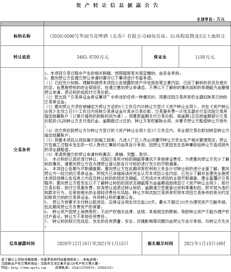 華潤雪花啤酒(長春)有限公司49處房屋、31項(xiàng)構(gòu)筑物及5宗土地轉(zhuǎn)讓(第一次降價(jià))