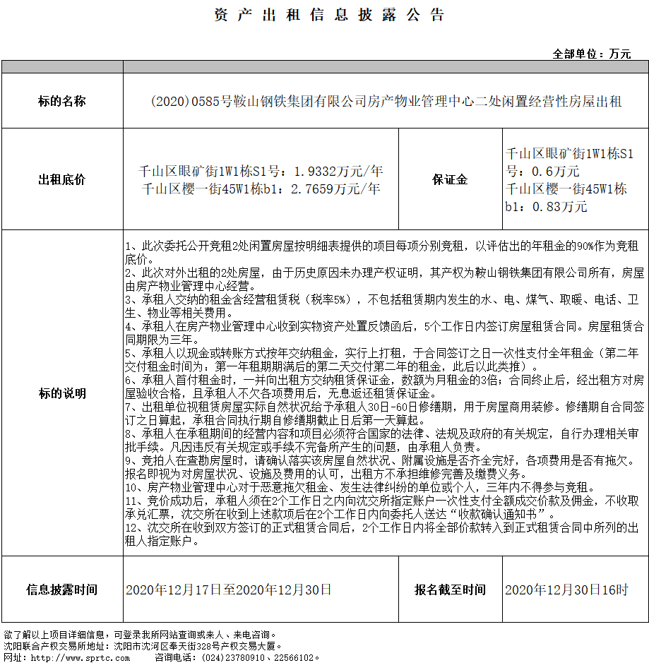 鞍山鋼鐵集團(tuán)有限公司房產(chǎn)物業(yè)管理中心房產(chǎn)出租 10千山區(qū)眼礦街1W1棟S1號(hào)