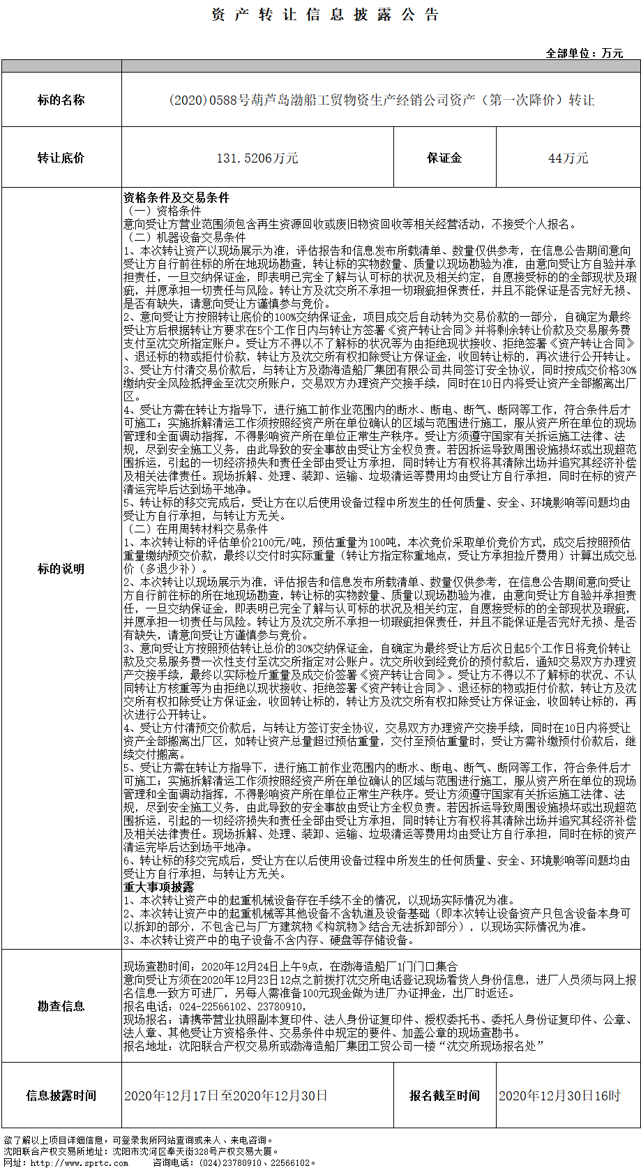 葫蘆島渤船工貿(mào)物資生產(chǎn)經(jīng)銷公司資產(chǎn)(第一次降價(jià))轉(zhuǎn)讓