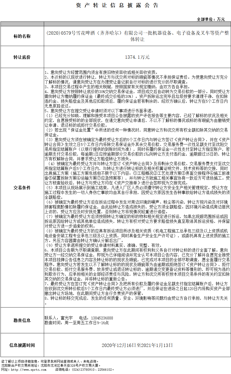 雪花啤酒(齊齊哈爾)有限公司一批機器設(shè)備、電子設(shè)備及叉車等資產(chǎn) 整體轉(zhuǎn)讓