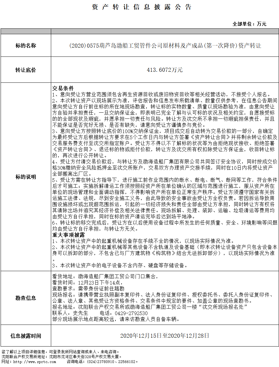 葫蘆島渤船工貿(mào)管件公司原材料及產(chǎn)成品(第一次降價(jià))資產(chǎn)轉(zhuǎn)讓