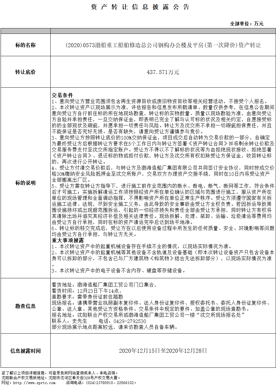 渤船重工船舶修造總公司鋼構(gòu)辦公樓及平房(第一次降價(jià)) 資產(chǎn)轉(zhuǎn)讓