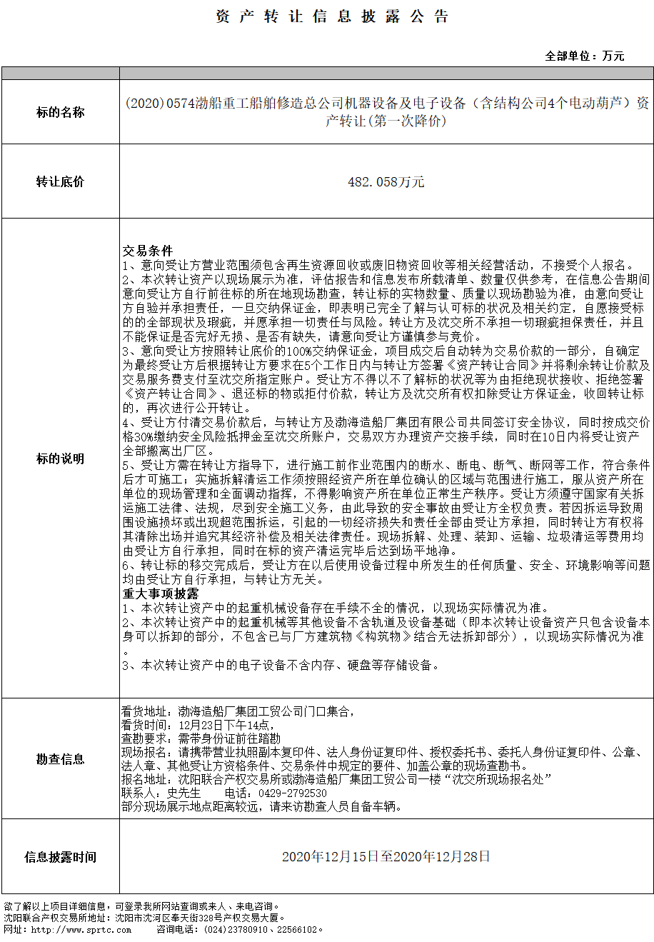 渤船重工船舶修造總公司機(jī)器設(shè)備及電子設(shè)備(含結(jié)構(gòu)公司4個(gè)電動葫蘆)資產(chǎn)轉(zhuǎn)讓(第一次降價(jià))