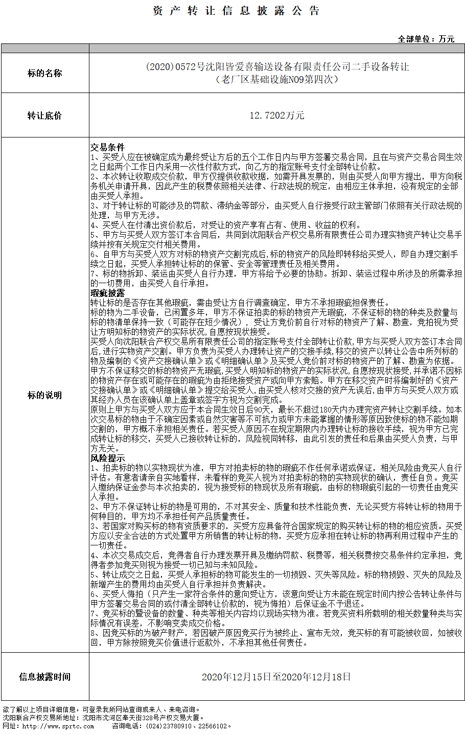 沈陽皆愛喜輸送設備有限責任公司二手設備轉讓(老廠區(qū)基礎設施NO9第四次)