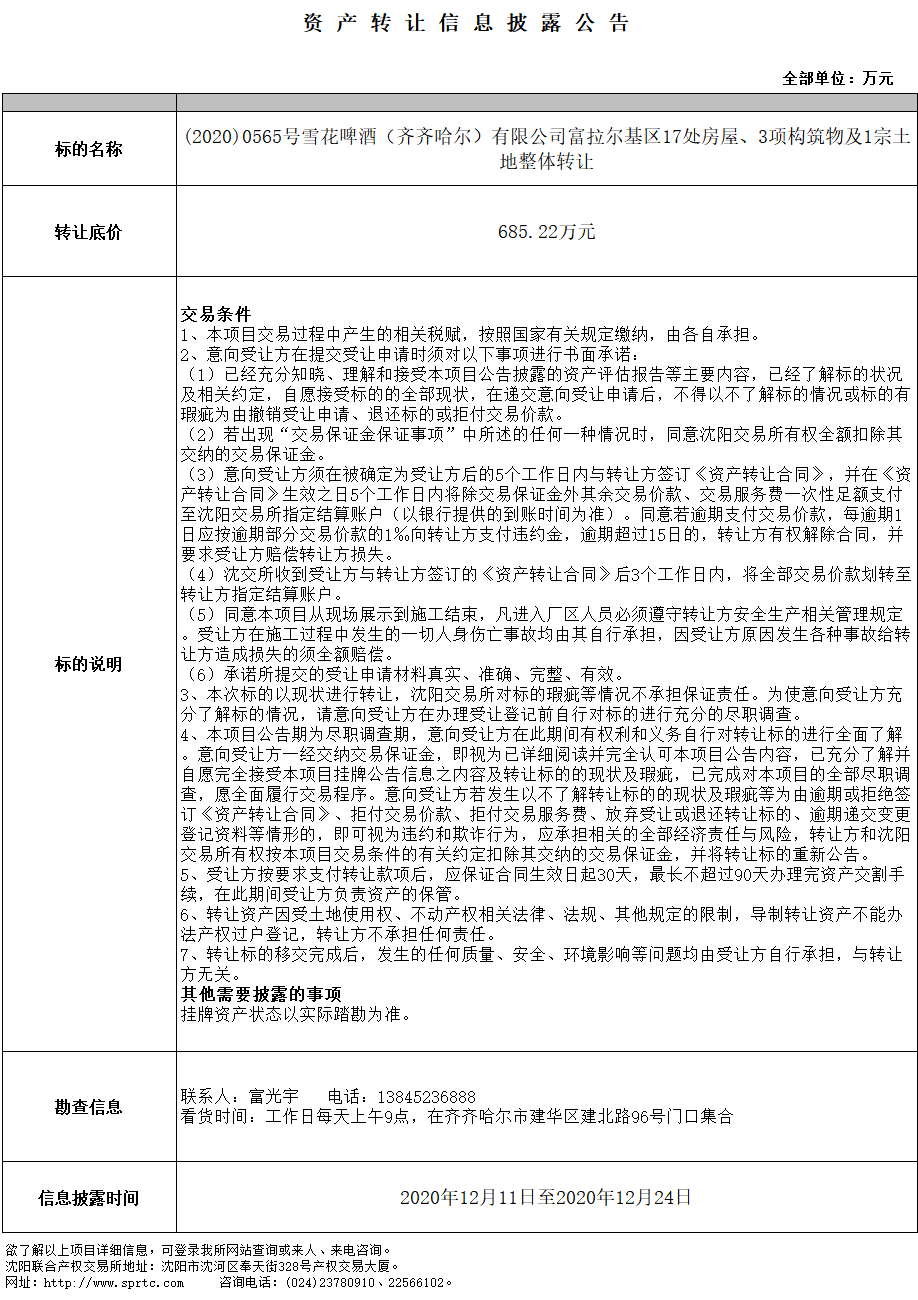 雪花啤酒(齊齊哈爾)有限公司富拉爾基區(qū)17處房屋、3項(xiàng)構(gòu)筑物及1宗土地整體轉(zhuǎn)讓