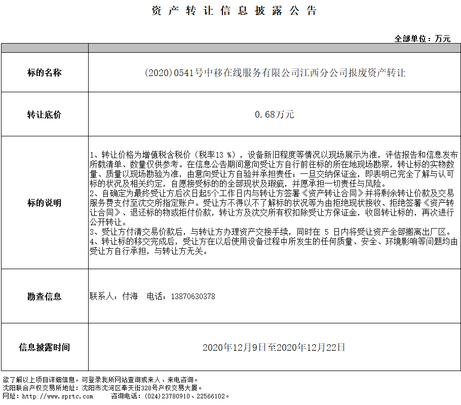 中移在線服務(wù)有限公司江西分公司報(bào)廢資產(chǎn)轉(zhuǎn)讓