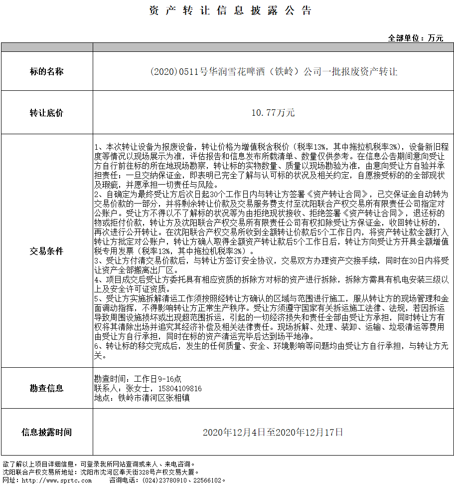 華潤雪花啤酒(鐵嶺)有限公司一批報廢資產(chǎn)轉(zhuǎn)讓